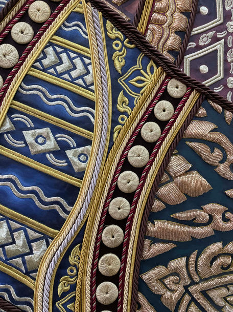 A vibrant collage that juxtaposes the intricate costumes depicted in the Ramayana mural at Wat Phra Kaew with the meticulous craftsmanship of traditional Khon embroidery. By layering images of these costumes, We aim to highlight the cultural significance of each garment, capturing the stories and characters they represent within the epic tale.